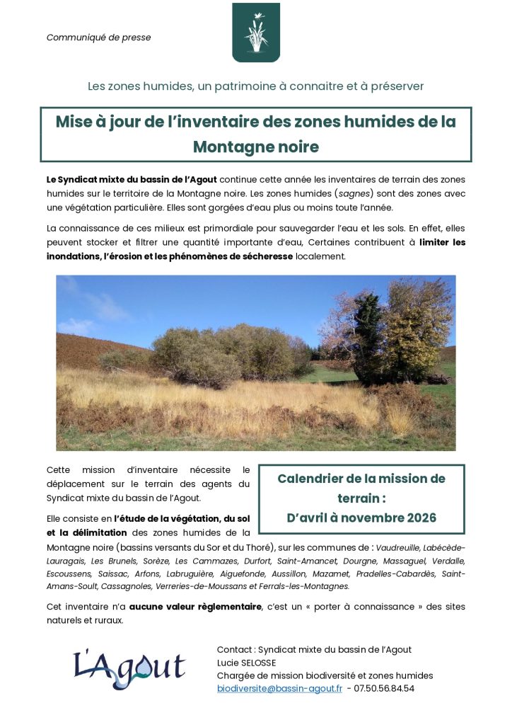 Cette année encore, le Syndicat Mixte de l’Agout continue les inventaires terrains pour la mise à jour des zones humides de la Montagne Noire. Plus d’informations sur ces prospections terrain ci-dessous :